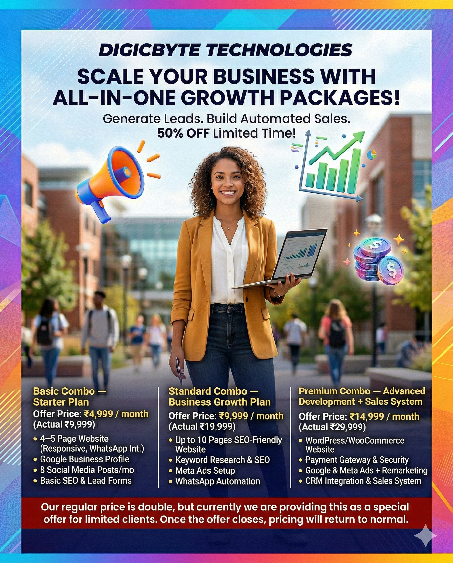 Website + Digital Marketing + Sales Support — everything your business needs in one transparent monthly combo. No setup fee. No lock-in.